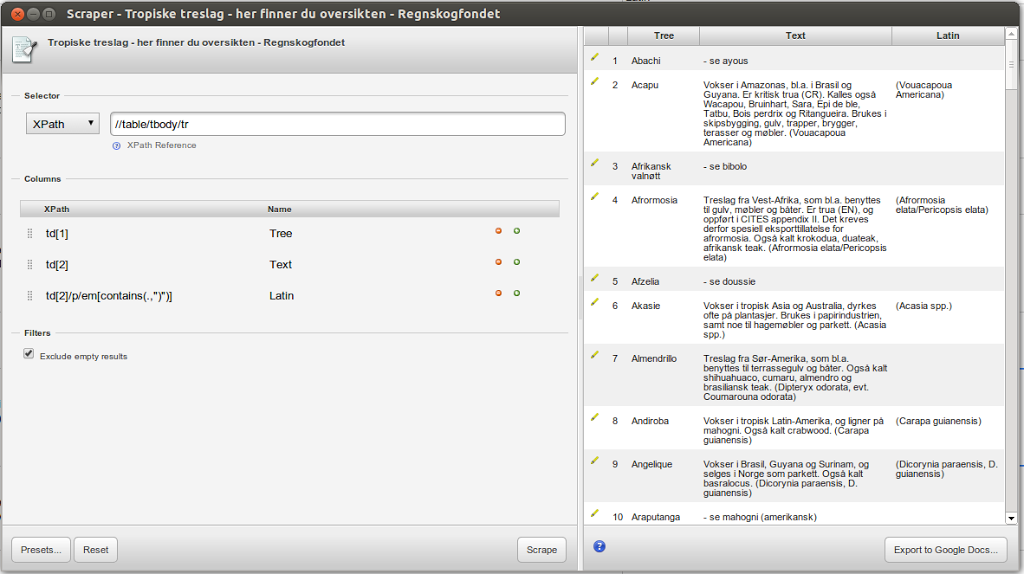 Let’s start with the list. Instead of using R all the way through, I scraped the HTML table rows with the Google Chrome extension Scraper, and saved data as a spreadsheet on Google Drive. This is the way Scraper works.