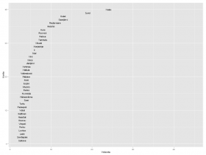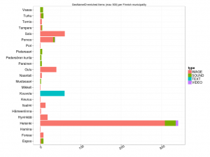 Europeana resources are divided in four media types: image, sound, text and video. Here I visualize the raw numbers in few separate graphs, roughly based on the number of items. Otherwise it would be difficult to see any nuances between municipalities. The R code of stacked bars is adapted from the Louhos Datavaalit examples. Note that what I did not succeed in doing yet was to sort the bars based on the size of item counts; maybe some misunderstanding from my part on how the factor levels are working.