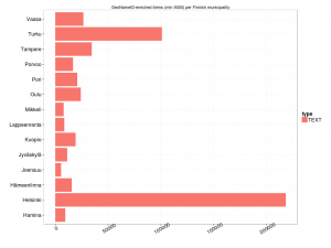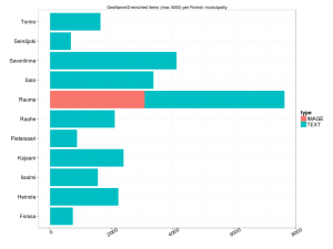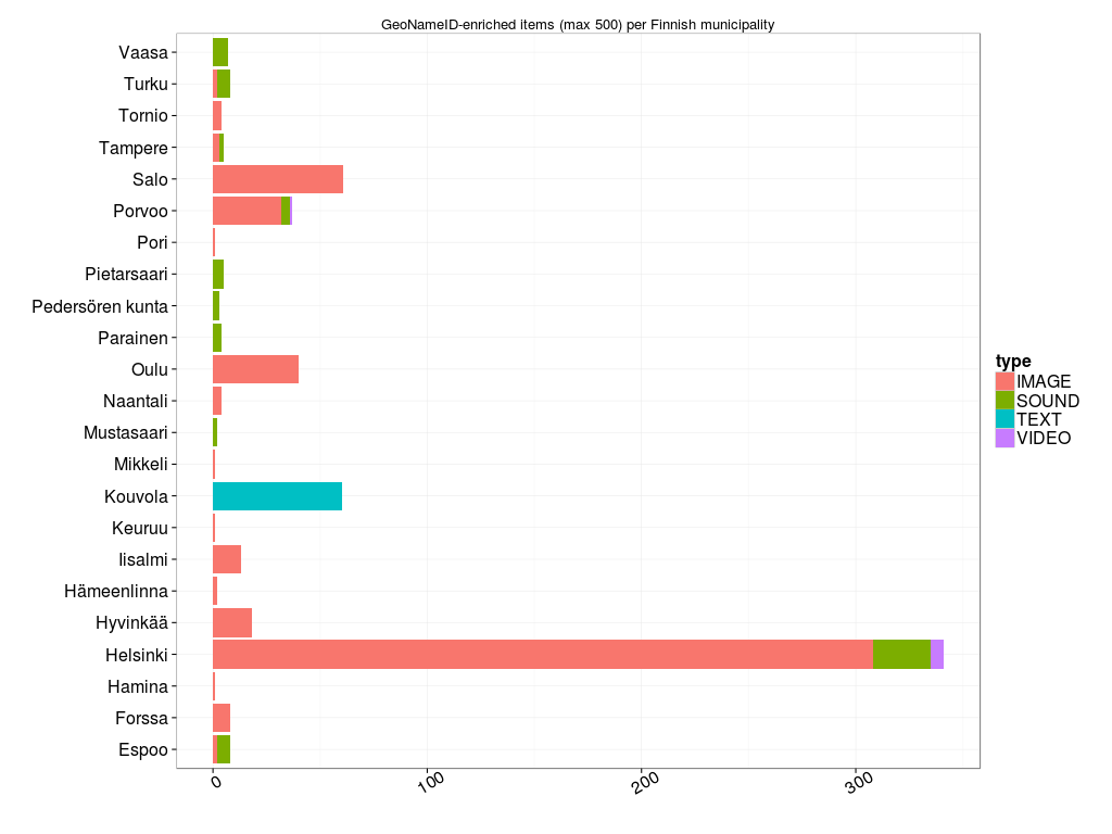 Some 8% of municipalities lack the ID, but that’s good enough for my purposes. With the list of municipality names, I gathered the IDs by querying the SPARQL endpoint of DBpedia. The names themselves I had downloaded previously from the National Land Survey of Finland via the indispensable R package soRvi. With the IDs at hand, I turned to Europeana again. This time, I was interested in how much geonamed items there were in different categories.