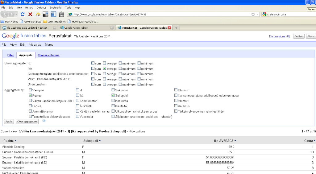 Käytin yhteisen avaimen muodostamisen yrittämiseen useita tunteja. Lopputulos: ei tullut avainta, mutta tulipa kokemusta datan siivoamis- ja esitystyökaluista Google Refine ja Google Fusion Tables. Ynnä hämmennystä ja lievää manailua Google Docs -hipsuista ja muista yllätyksistä.