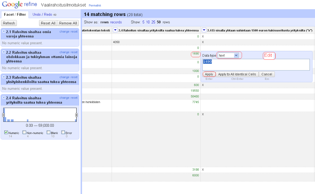 Rahasummia tullaan laskeskelemaan ja vertailemaan. Niiden on siis syytä olla tietotyypiltään samanlaisia. Annoin Refinen lukufasetin (numeric facet) käydä läpi kaikki ne Puoluerahoitusvalvonnan taulukon sarakkeet, joissa oli rahasummia. Suurin osa oli tekstityyppiä, mutta joukossa oli myös numeerista dataa.