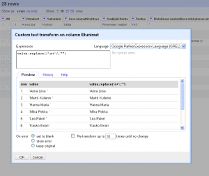 Google Refine Expression Language (GREL) ymmärtää säännöllsiä lausekkeita. Alla poistetaan Etunimet-sarakkeen soluista lopun tyhjät merkit ja sulkeva hipsu.